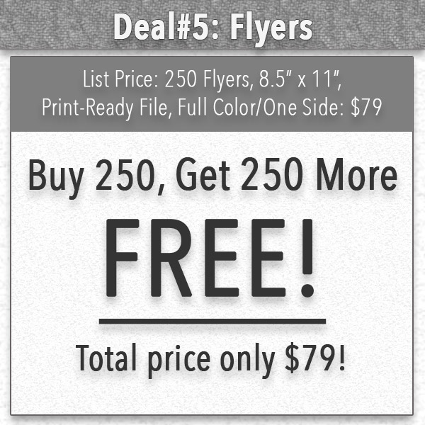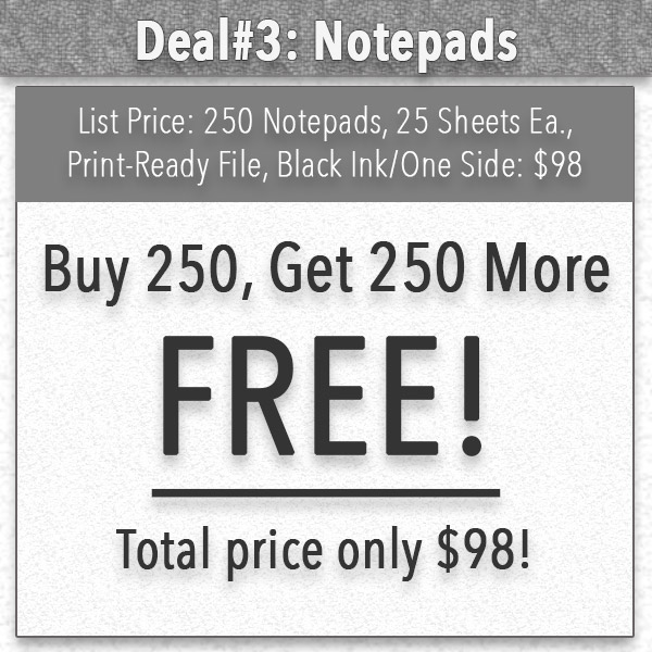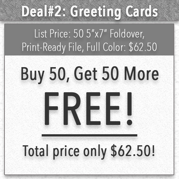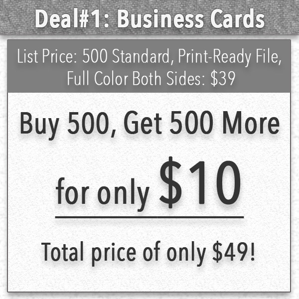 These deals are so good we had to give them their own website. Order soon though! They might not be here tomorrow! As part of American Print Group - we print everything. You never know what deals will be on here next! Check back often so you don't miss something great. | How It Works: 1) Find the deal you want below. 2) Give us a call or e-mail us, let us know the code and what you'd like printed. We will ask you for a print ready file, or we can design for you for an additional set-up fee. 3) Save $$$. |